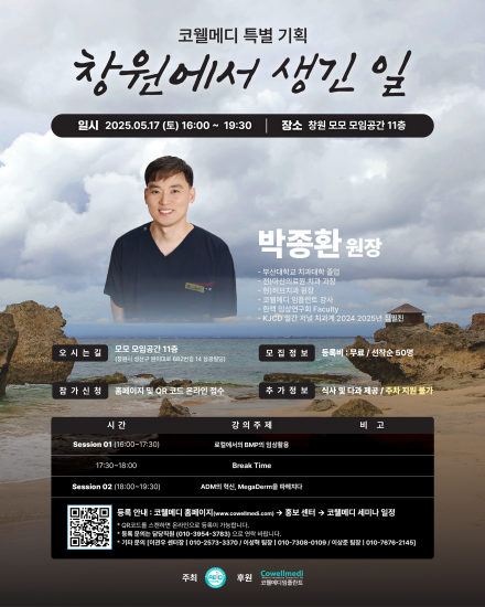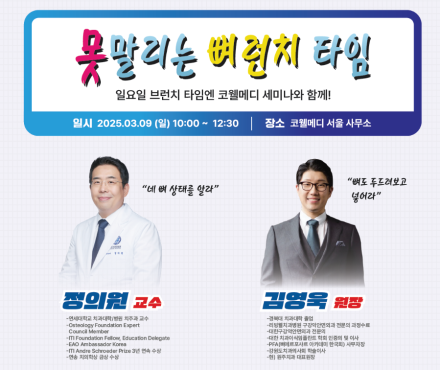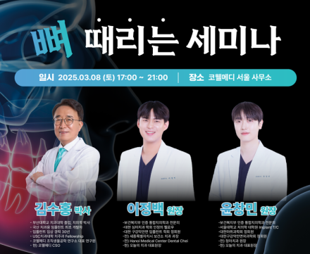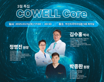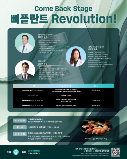 임플란트 연구소 in BUSAN 일시:2025-12-13 장소:부산치과의사신협 5층 회의실 (부산광역시 연제구 월드컵대로 190) GBR PUB in 청주 일시:2025-12-13 장소:청주 더나눔 - 대회의실 Achieving the Total Digital Workflow - 디지털 가이드 진단부터 보철까지! 일시:2025-12-06 장소:코웰메디 서울 삼성캠퍼스 DENTAL NOTE – 임플란트의 성공, 그 모든 기록이 깨어난다 일시:2025-11-29 장소:코웰메디 서울 삼성캠퍼스 CIC 2025 : COWELL® International Conference 일시:2025-11-01 장소:shanghai GBR & INSIGHT 일시:2025-10-25 장소:코웰메디 서울 삼성캠퍼스 Show me the FIT 일시:2025-10-25 장소:광주 김대중컨벤션센터 208호 (광주 서구 상무누리로 30) GBR UNIVERSE 일시:2025-10-18 장소:수토피아HR컨설팅 대구 (대구 동구 동부로 174 대한빌딩 6층) Show me the Membrane 일시:2025-10-18 장소:코웰메디 서울 삼성캠퍼스 ALL IN ONE Solution 일시:2025-09-27 장소:코웰메디 서울 삼성캠퍼스 뼈플란트 Revolution 2.0 일시:2025-09-20 장소:코웰메디 서울 삼성캠퍼스 Bone Up! with BMP 일시:2025-09-06 장소:코웰메디 서울 삼성캠퍼스 COWELL® Poster Competition 2025 일시:2025-09-01 장소:코웰메디 국제 컨퍼런스 All on X 전략을 이용한 전악 수복 환자의 치료 일시:2025-08-31 장소:코웰메디 서울 삼성캠퍼스 장호열 원장의 상악골 & GBR 원데이 솔루션 일시:2025-08-30 장소:코웰메디 서울 삼성캠퍼스 Implant R.A.C.E 일시:2025-08-23 장소:코웰메디 서울 삼성캠퍼스 ALL IN ONE Solution 일시:2025-07-19~2025-07-19 장소:대전 동구 태전로 18, 7층 부산치과의신협 5층 회의실 뼈플란트 전성시대 일시:2025-07-05 장소:코웰메디 서울 GBR Frontiers & Beyond 일시:2025-06-28 장소:롯데월드타워 스카이31 컨벤션 골증강술 완전 정복 일시:2025-06-21 장소:코웰메디 서울 H.O 1 2 3 4 5