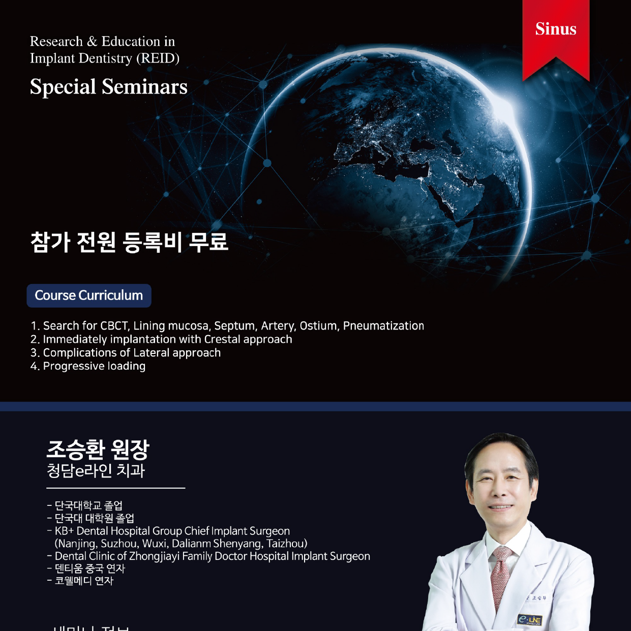REID Special Seminar Course - Sinus 일시: 2022-05-14 <16:00 ~ 20:00> 장소: 코웰메디 서울 서초사무소 세미나실 / 부산치과의사신협 7층 세미나실 이전글 REID Special Seminars - GBR & Digital 다음글 REID Special Seminar Course - GBR 목록