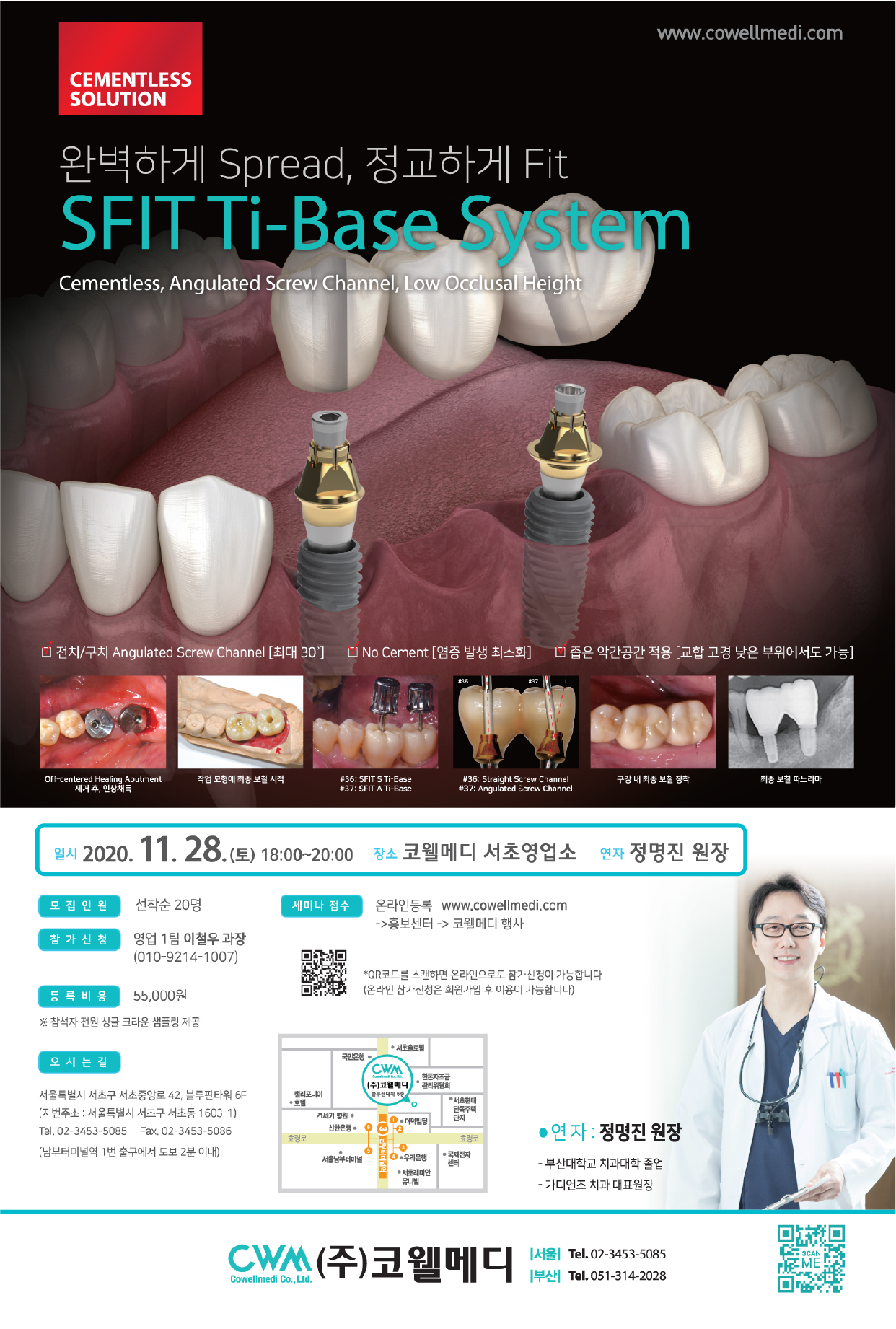 SFIT Ti-Base System 일시: 2020-11-28 <18:00~20:00> 장소: 코웰메디 서초사무실 이전글 Wifi-Mesh를 이용한 Clinical benefits of a novel non-resorbable membrane 다음글 개원의를 위한 2019 SMART DENTISTRY 목록