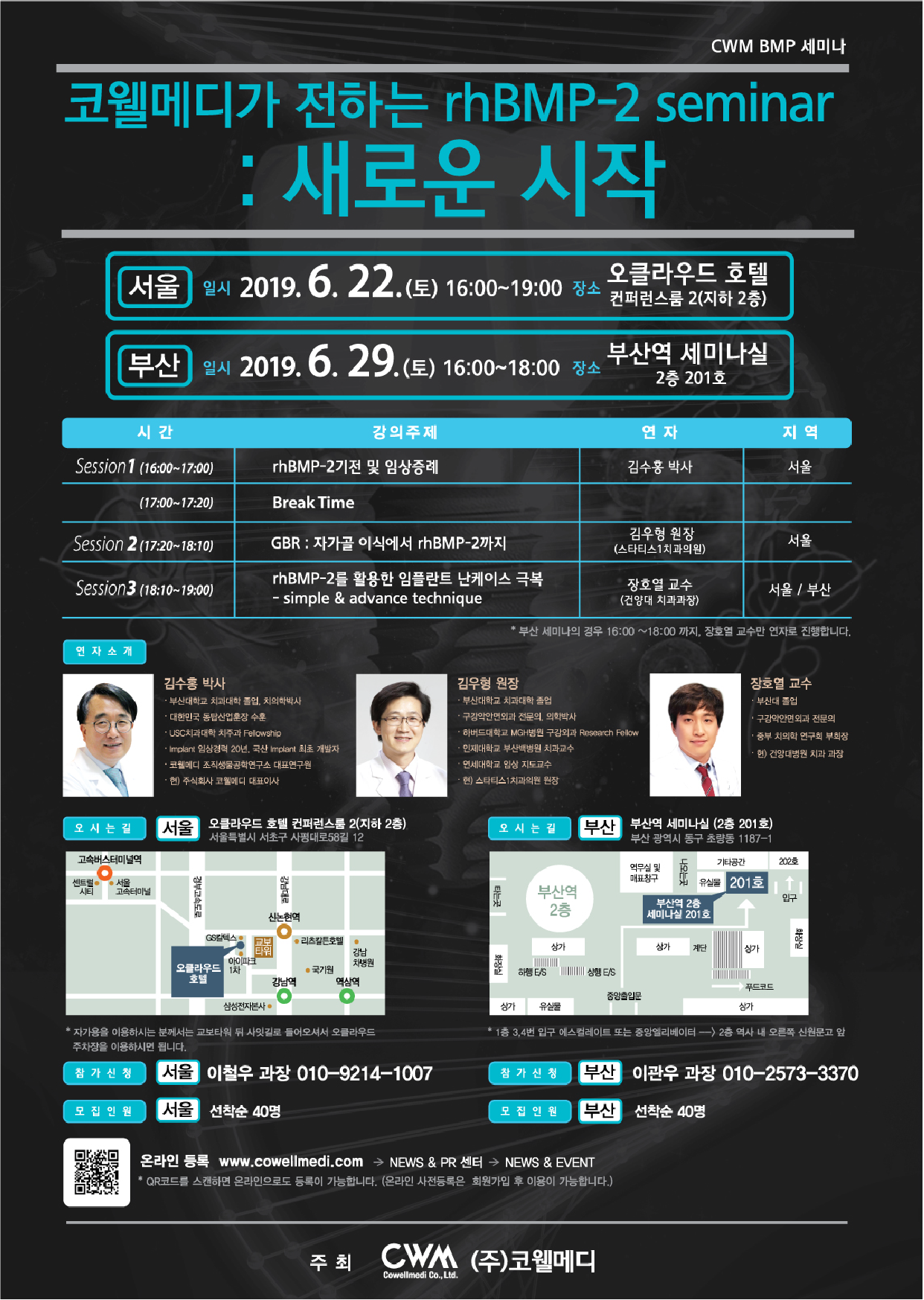 코웰메디가 전하는 rhBMP-2 seminar : 새로운 시작 일시: 2019-06-22 ~ 2019-06-29 장소: 오클라우드 호텔/부산역 세미나실 이전글 코웰메디 rhBMP-2 seminar : 10년의 성과, 미래의 변화 다음글 COWELL® International Conference 2019 목록