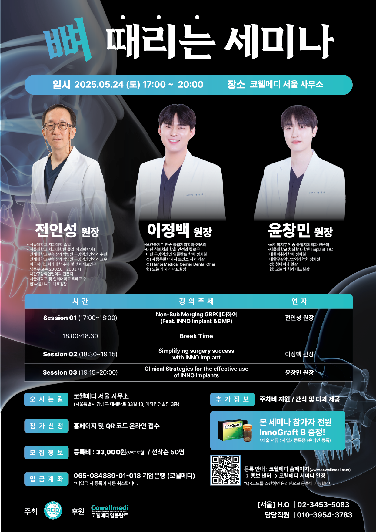 치조골 증강과 임플란트 성공 전략을 한 번에 배울 수 있는 임상 세미나가 코웰메디 서울 사무소에서 열립니다. GBR, BMP, INNO Implant에 관심 있는 임상의라면 놓칠 수 없는 기회입니다.