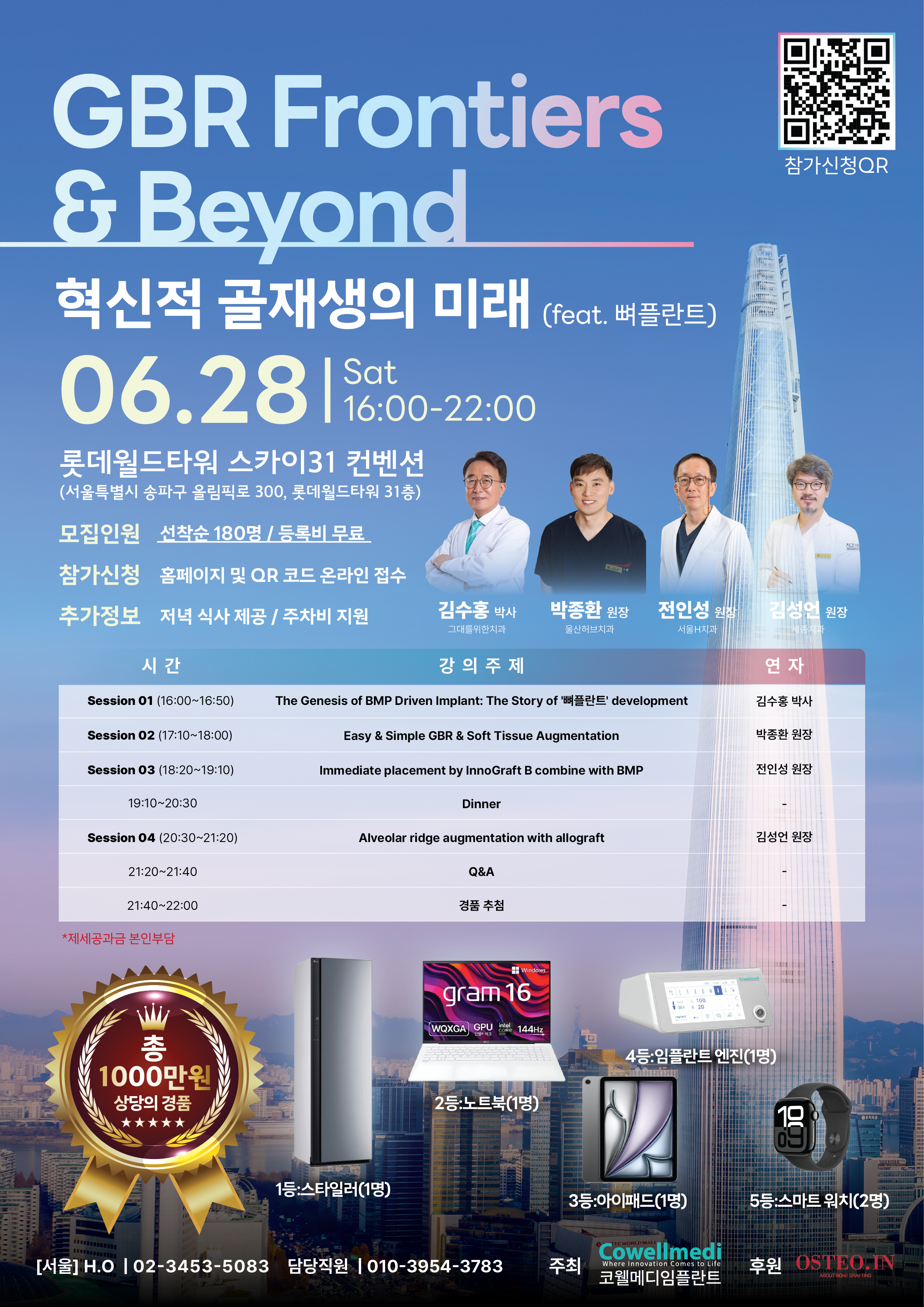 GBR Frontiers & Beyond 일시: 2025-06-28 장소: 롯데월드타워 스카이31 컨벤션 GBR Frontiers & Beyond 1,000만원 상당의 경품 추첨! 혁신적 골재생의 미래를 함께 만나는 무료 세미나입니다. 일시: 6월 28일 (토) 16:00~22:00 장소: 롯데월드타워 스카이31 (31층) 참가비: 무료 (저녁 식사 및 주차 지원) 총 1,000만원 상당의 경품 1등: 스타일러 2등: 노트북 3등: 아이패드 4등: 임플란트 엔진 5등: 스마트워치 (2명) 선착순 180명 모집 신청 링크: https://forms.gle/S7h7mPn9xgAv8V1J8 문의: 010-3954-3783 많은 관심과 참여 부탁드립니다. 감사합니다. 이전글 뼈 때리는 세미나 다음글 Implant ONE DAY Solution 목록
